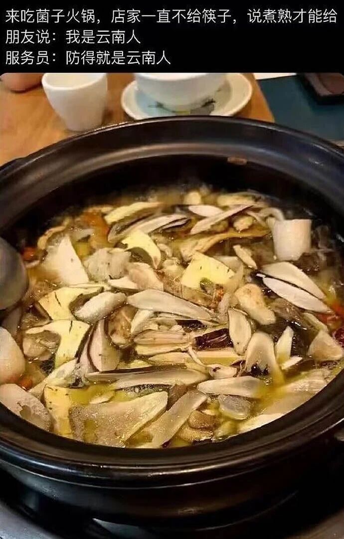 外地人胆子小,不熟透了不敢吃。云南人:这种菇烫一下就可以吃。