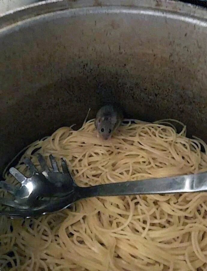 :老板,你们厨师掉意面里了!