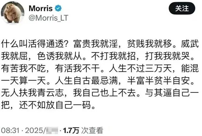 格局要打开,能怪别人的事情,尽量不要怪自己。拒绝精神内耗,有事直接发疯。—— 毛姆